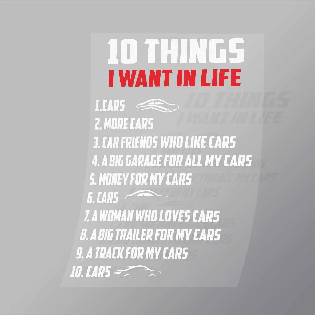 A great 10 Things I Want In Life DTF (Direct to Film) Transfer available in multiple sizes. (Beased on width at artwork aspect ratio)