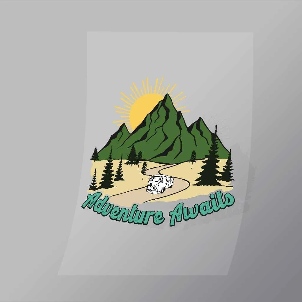 A great Adventure Awaits DTF (Direct to Film) Transfer available in multiple sizes. (Beased on width at artwork aspect ratio)
