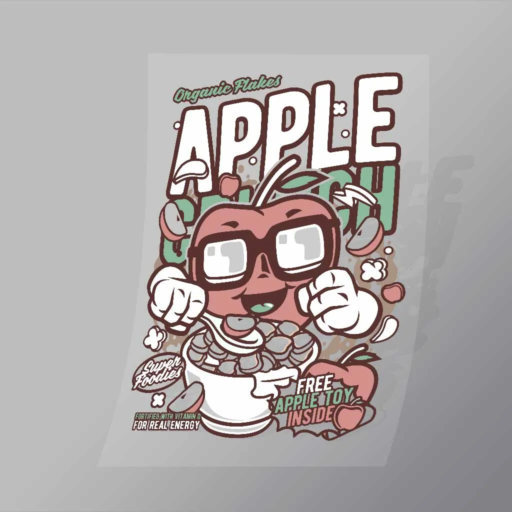 A great Apple Crunch DTF (Direct to Film) Transfer available in multiple sizes. (Beased on width at artwork aspect ratio)