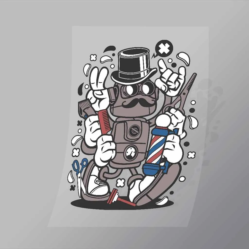 A great Barber Robot DTF (Direct to Film) Transfer available in multiple sizes. (Beased on width at artwork aspect ratio)
