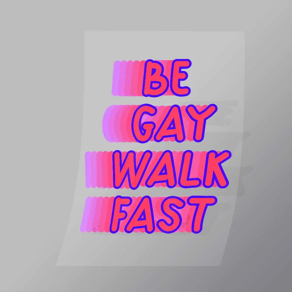 A great Be Gay Walk Fast DTF (Direct to Film) Transfer available in multiple sizes. (Beased on width at artwork aspect ratio)