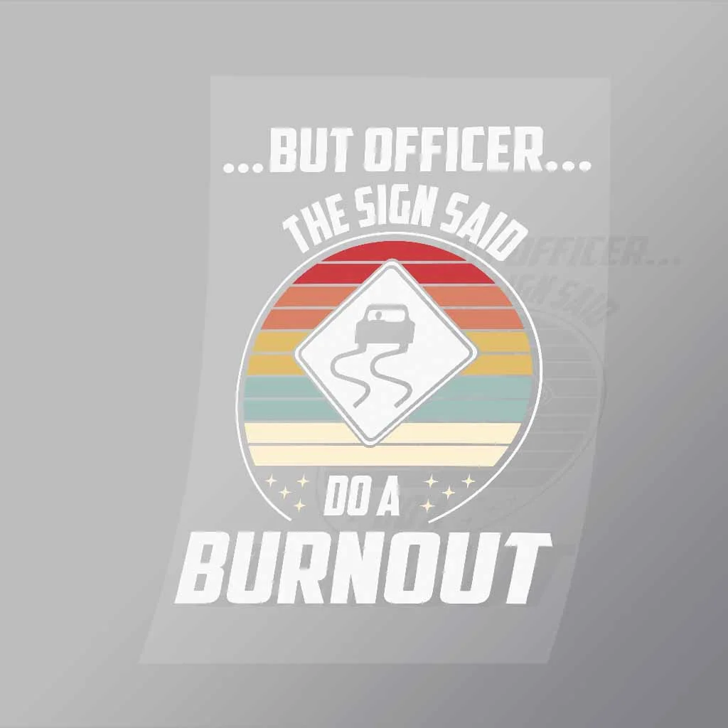 A great But Officer The Sign Said Do A Burnout DTF (Direct to Film) Transfer available in multiple sizes. (Beased on width at artwork aspect ratio)