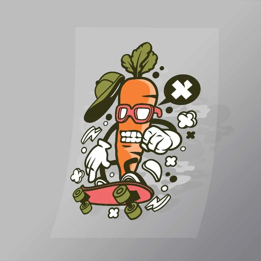 A great Carrot Skater DTF (Direct to Film) Transfer available in multiple sizes. (Beased on width at artwork aspect ratio)