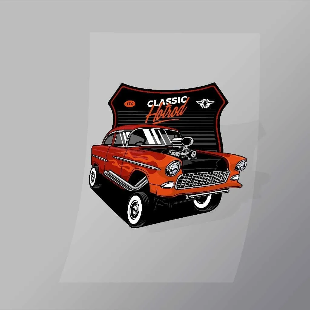 A great Classic Hotrod DTF (Direct to Film) Transfer available in multiple sizes. (Beased on width at artwork aspect ratio)