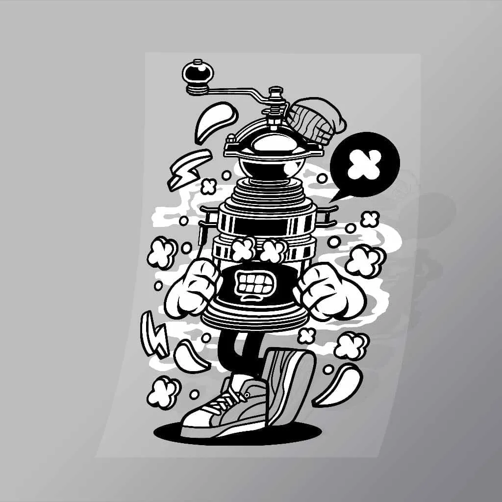 A great Coffee Grinder DTF (Direct to Film) Transfer available in multiple sizes. (Beased on width at artwork aspect ratio)