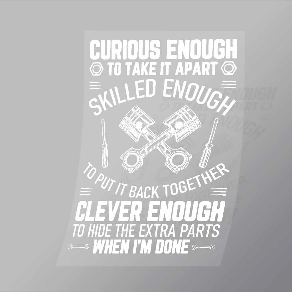 A great Curious Mechanic DTF (Direct to Film) Transfer available in multiple sizes. (Beased on width at artwork aspect ratio)