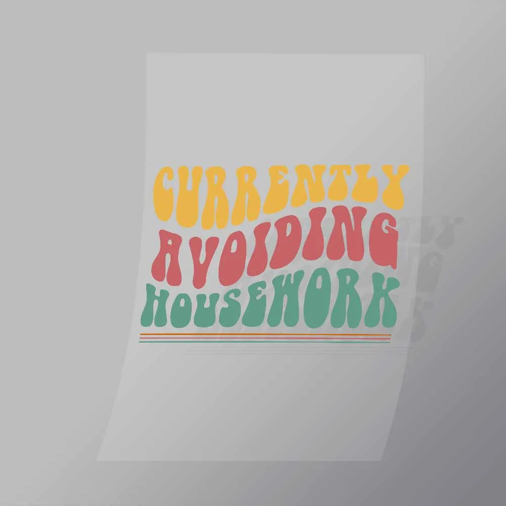 A great Currently Avoiding Housework DTF (Direct to Film) Transfer available in multiple sizes. (Beased on width at artwork aspect ratio)