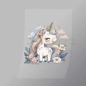 A great Cute Unicorn Pastel DTF (Direct to Film) Transfer available in multiple sizes. (Beased on width at artwork aspect ratio)