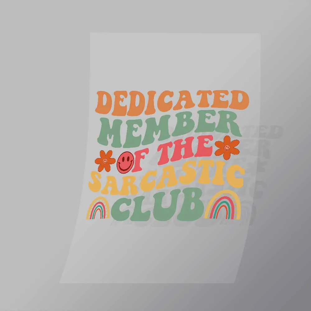 A great Dedicated Member Of The Sarcastic Club DTF (Direct to Film) Transfer available in multiple sizes. (Beased on width at artwork aspect ratio)