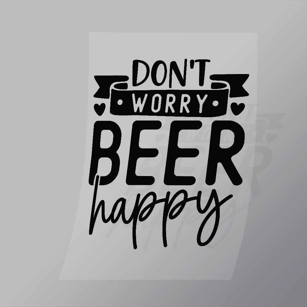 A great Dont Worry Beer Happy Black DTF (Direct to Film) Transfer available in multiple sizes. (Beased on width at artwork aspect ratio)