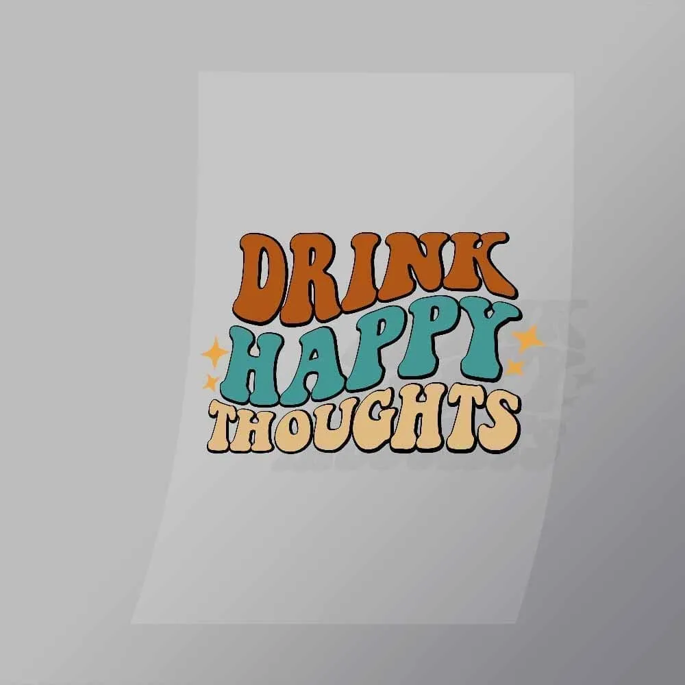 A great Drink Happy Thoughts DTF (Direct to Film) Transfer available in multiple sizes. (Beased on width at artwork aspect ratio)