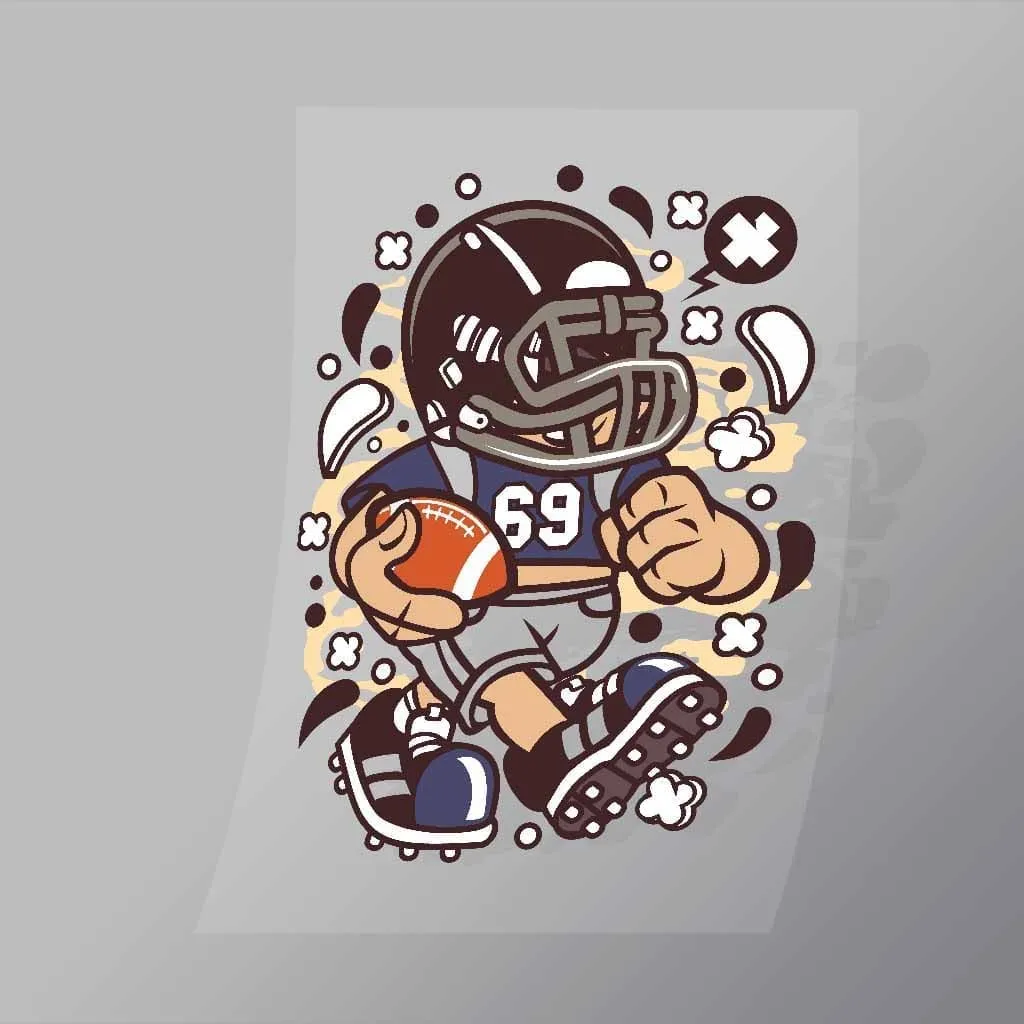 A great Football Kid DTF (Direct to Film) Transfer available in multiple sizes. (Beased on width at artwork aspect ratio)