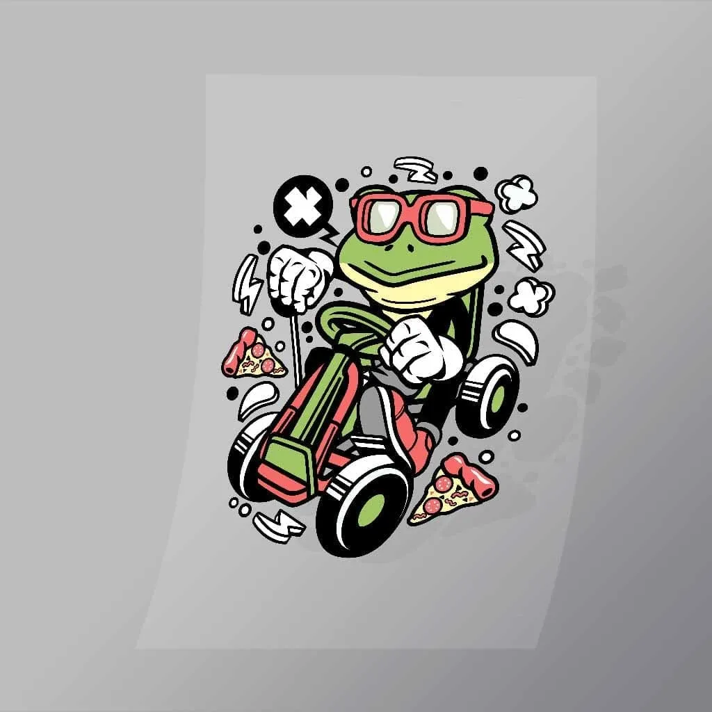 A great Frog Gokart Racer DTF (Direct to Film) Transfer available in multiple sizes. (Beased on width at artwork aspect ratio)