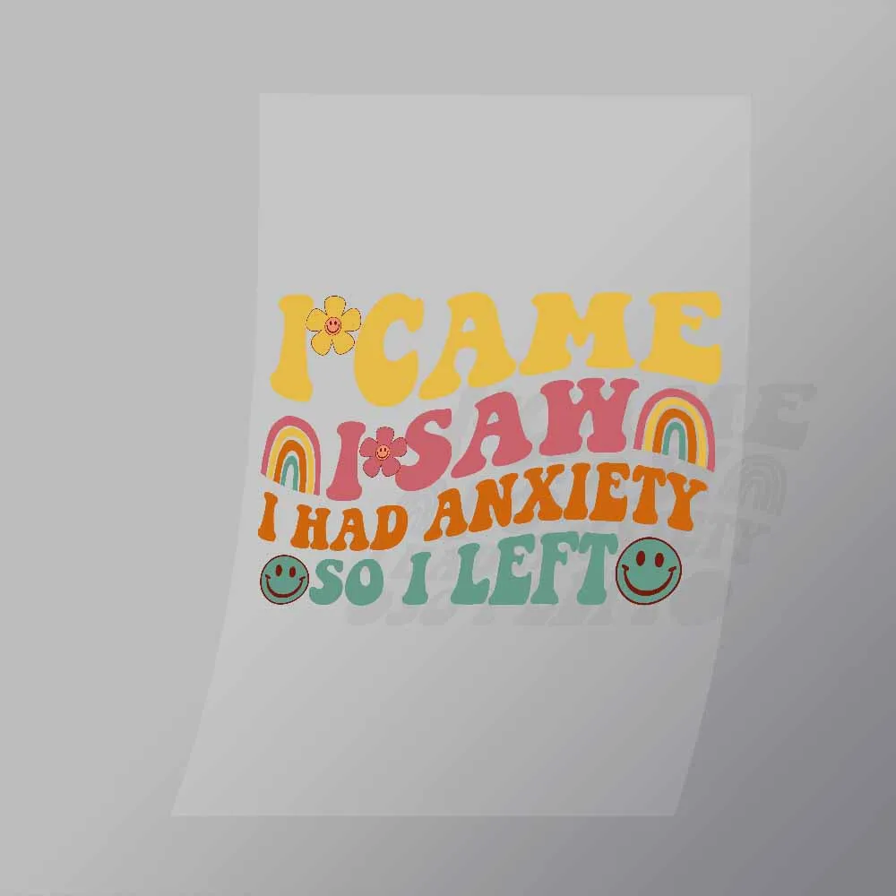 A great I Came I Saw I Had Anxiety So I Left DTF (Direct to Film) Transfer available in multiple sizes. (Beased on width at artwork aspect ratio)