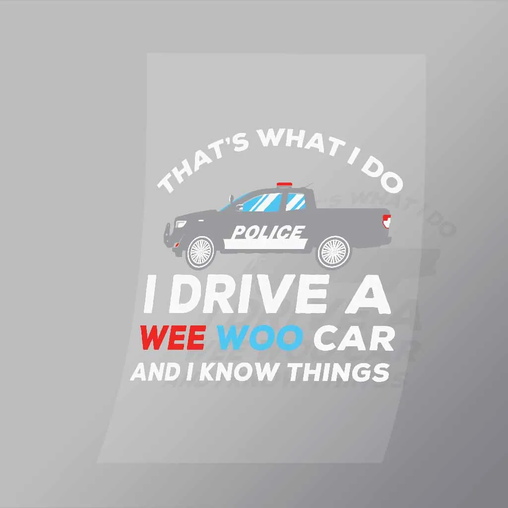 A great I Drive A Wee Woo Car And I Know Things DTF (Direct to Film) Transfer available in multiple sizes. (Beased on width at artwork aspect ratio)