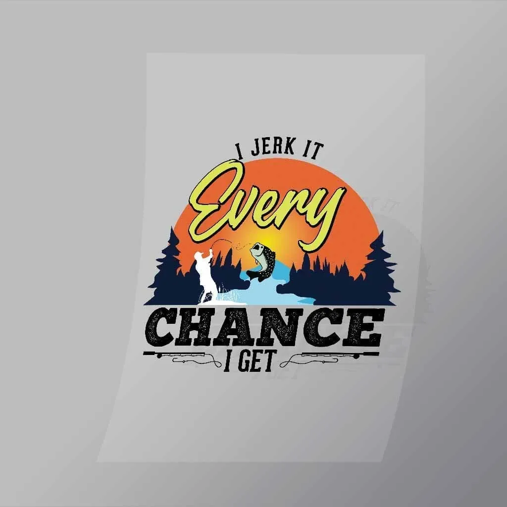 A great I Jerk It Every Chance I Get DTF (Direct to Film) Transfer available in multiple sizes. (Beased on width at artwork aspect ratio)