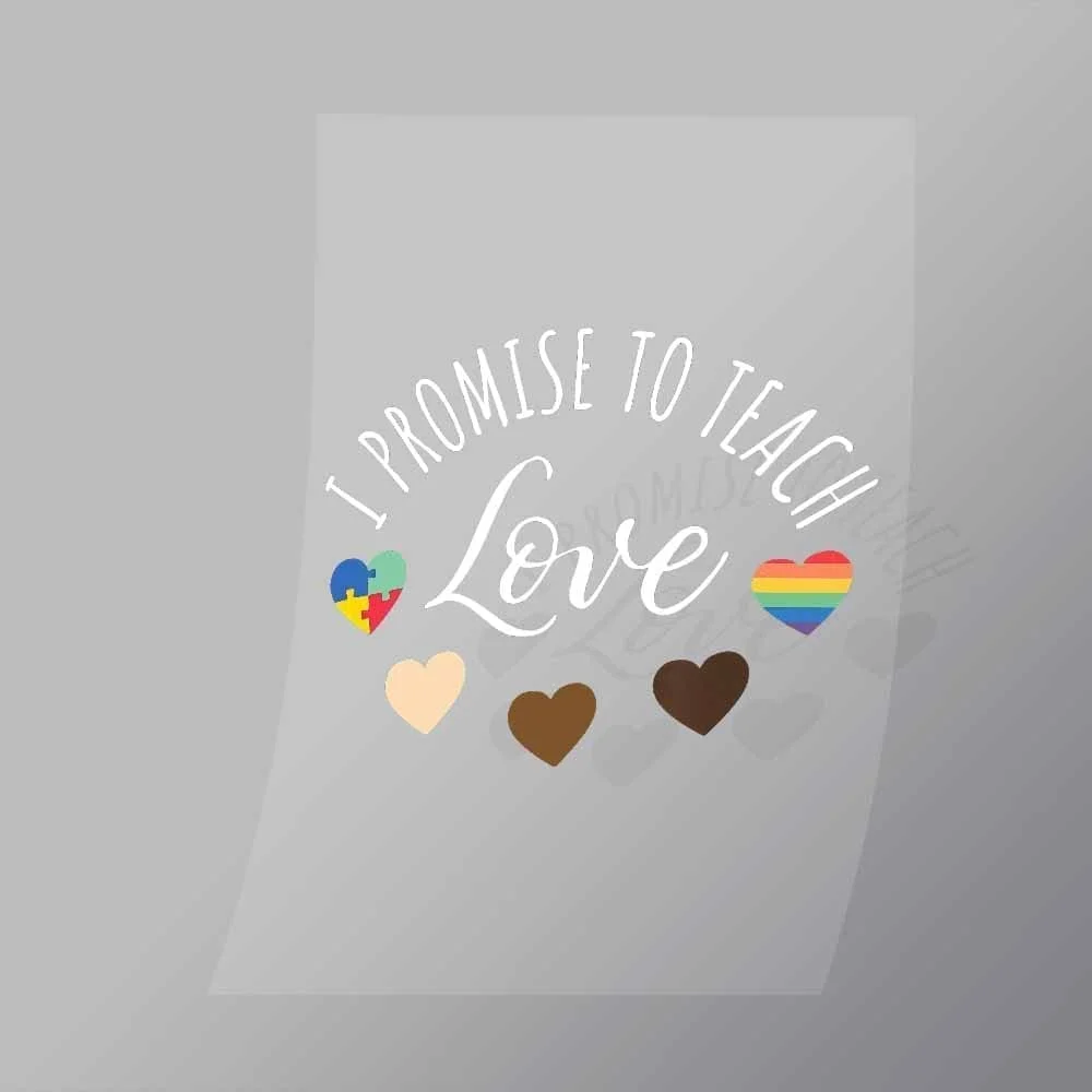 A great I Promise To Teach Love DTF (Direct to Film) Transfer available in multiple sizes. (Beased on width at artwork aspect ratio)
