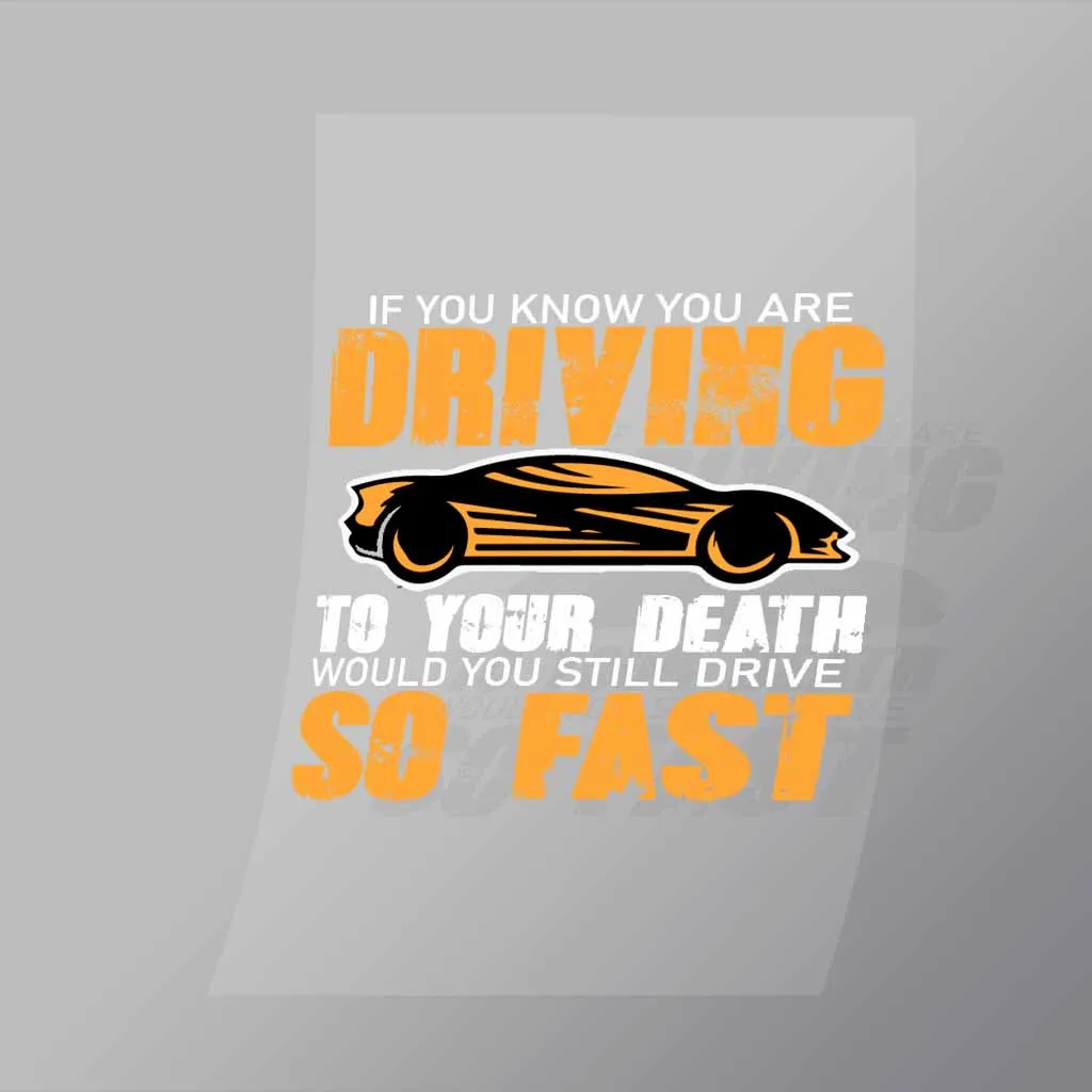 A great If You Know You Are Driving To Your Death Would You Still Drive So Fast DTF (Direct to Film) Transfer available in multiple sizes. (Beased on width at artwork aspect ratio)