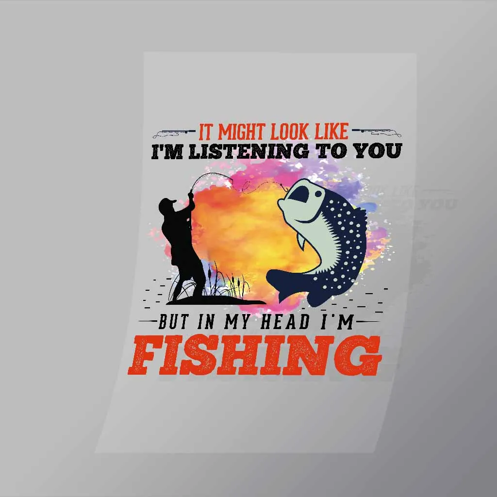 A great It Might Look Like Im Listening But Im Thinking Fishing DTF (Direct to Film) Transfer available in multiple sizes. (Beased on width at artwork aspect ratio)