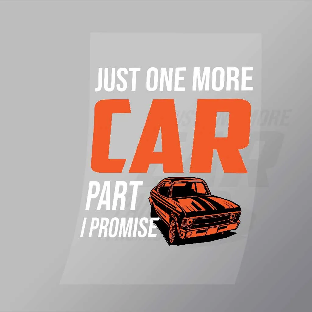 A great Just One More Car Part I Promise DTF (Direct to Film) Transfer available in multiple sizes. (Beased on width at artwork aspect ratio)