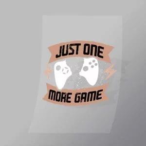 A great Just One More Games DTF (Direct to Film) Transfer available in multiple sizes. (Beased on width at artwork aspect ratio)
