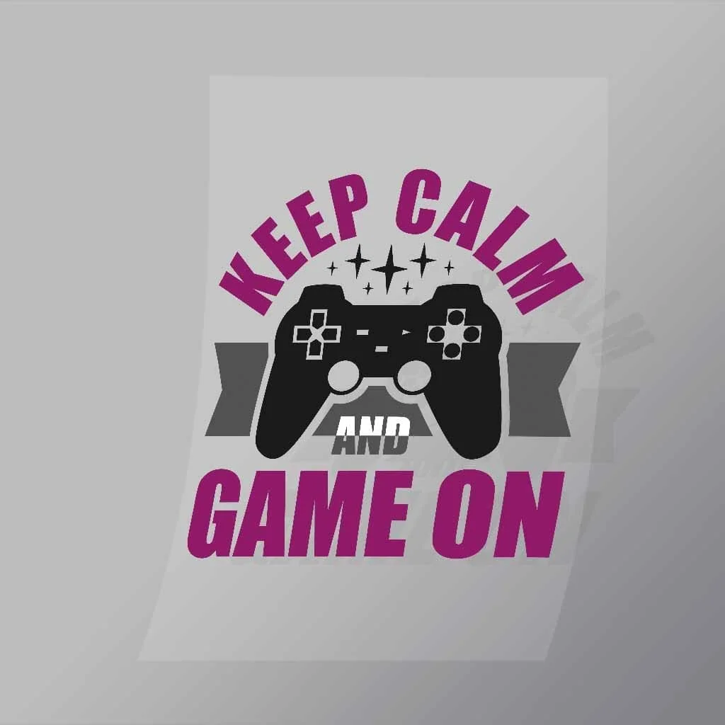 A great Keep Calm And Game On DTF (Direct to Film) Transfer available in multiple sizes. (Beased on width at artwork aspect ratio)