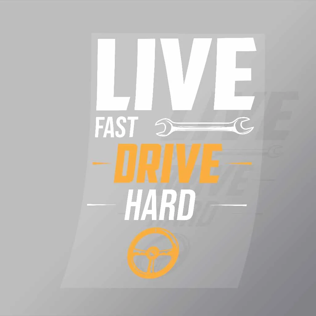 A great Live Fast Drive Hard DTF (Direct to Film) Transfer available in multiple sizes. (Beased on width at artwork aspect ratio)