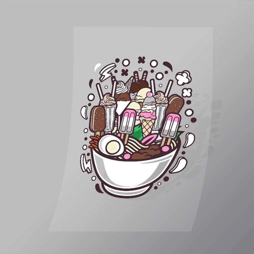 A great Ramen Ice Cream DTF (Direct to Film) Transfer available in multiple sizes. (Beased on width at artwork aspect ratio)