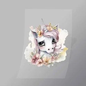 A great Smiling Unicorn DTF (Direct to Film) Transfer available in multiple sizes. (Beased on width at artwork aspect ratio)