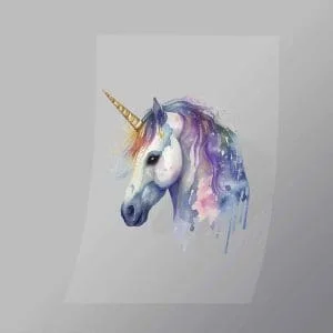 A great Splatter Unicorn DTF (Direct to Film) Transfer available in multiple sizes. (Beased on width at artwork aspect ratio)