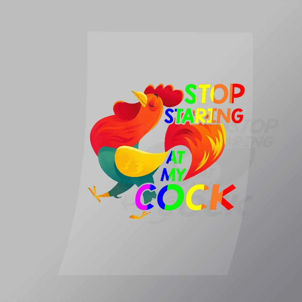 A great Stop Staring At My Cock DTF (Direct to Film) Transfer available in multiple sizes. (Beased on width at artwork aspect ratio)