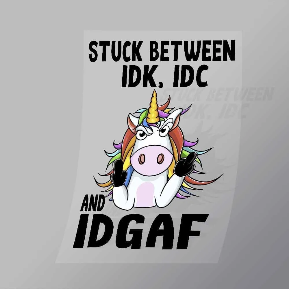 A great Stuck Between Idk Idc And Idgaf DTF (Direct to Film) Transfer available in multiple sizes. (Beased on width at artwork aspect ratio)