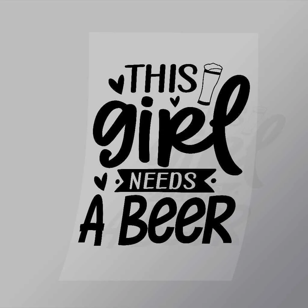 A great The Girl Needs A Beer Black DTF (Direct to Film) Transfer available in multiple sizes. (Beased on width at artwork aspect ratio)