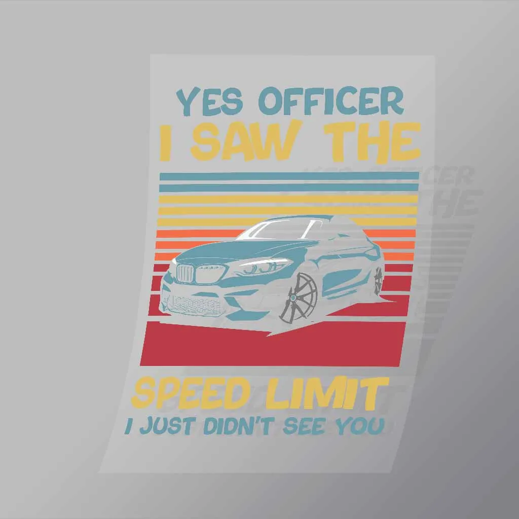 A great Yes Officer I Saw The Speed Limit I Just Didnt See You DTF (Direct to Film) Transfer available in multiple sizes. (Beased on width at artwork aspect ratio)