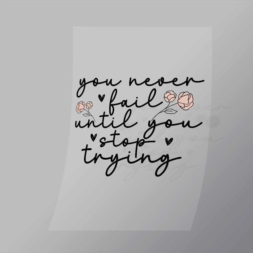 A great You Never Fail Until You Stop Trying DTF (Direct to Film) Transfer available in multiple sizes. (Beased on width at artwork aspect ratio)