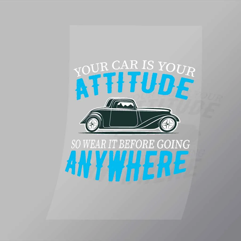 A great Your Car Is Your Attitude So Wear It Before Going Anywhere DTF (Direct to Film) Transfer available in multiple sizes. (Beased on width at artwork aspect ratio)