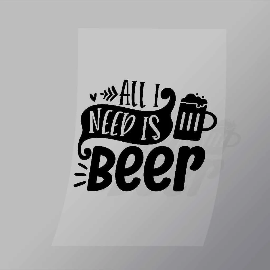 A great All I Need Is Beer Black DTF (Direct to Film) Transfer available in multiple sizes. (Beased on width at artwork aspect ratio)