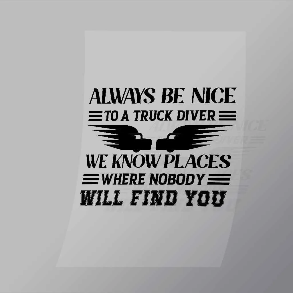 A great Always Be Nice To A Truck Driver DTF (Direct to Film) Transfer available in multiple sizes. (Beased on width at artwork aspect ratio)