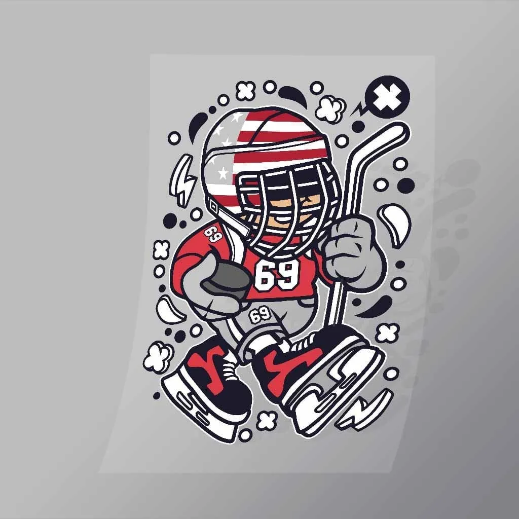 A great American Hockey Kid DTF (Direct to Film) Transfer available in multiple sizes. (Beased on width at artwork aspect ratio)