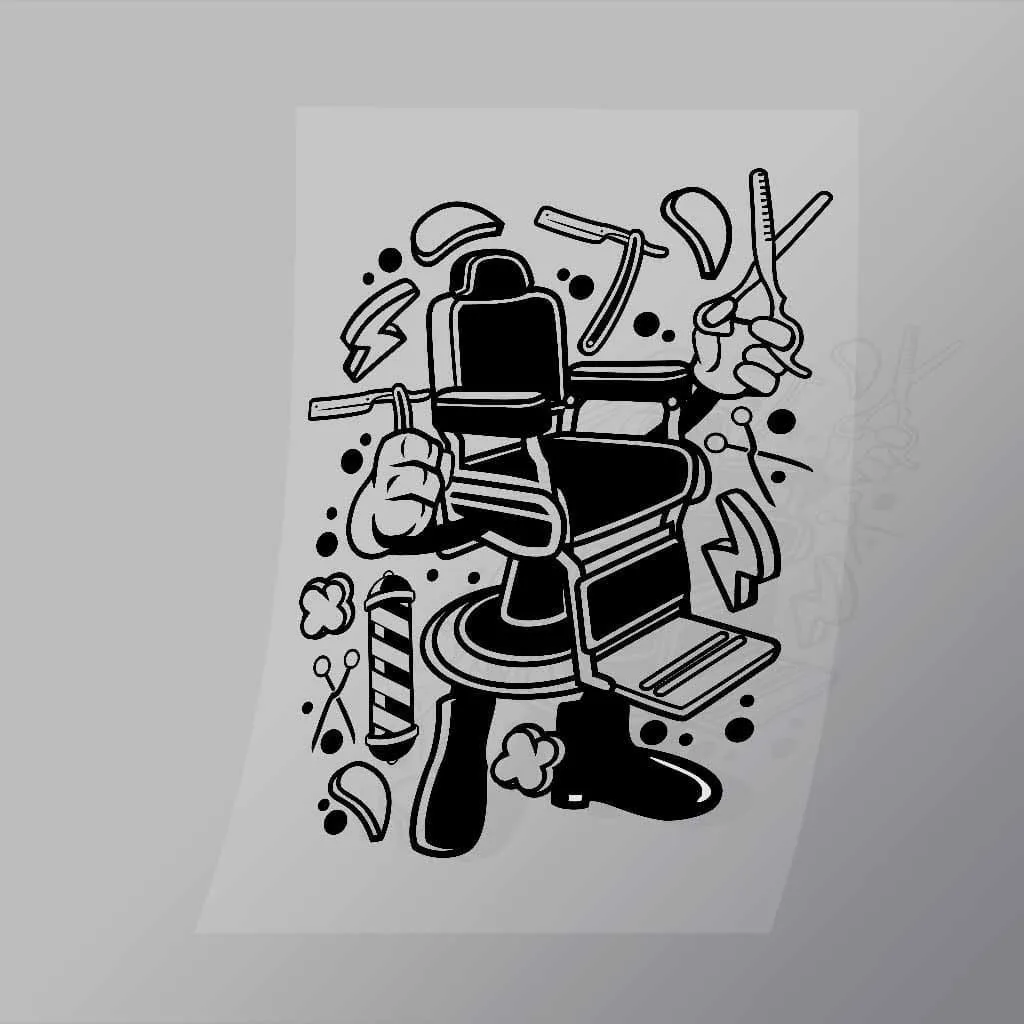 A great Barber Chair DTF (Direct to Film) Transfer available in multiple sizes. (Beased on width at artwork aspect ratio)