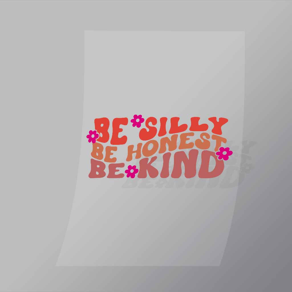 A great Be Silly Be Honest Be Kind DTF (Direct to Film) Transfer available in multiple sizes. (Beased on width at artwork aspect ratio)