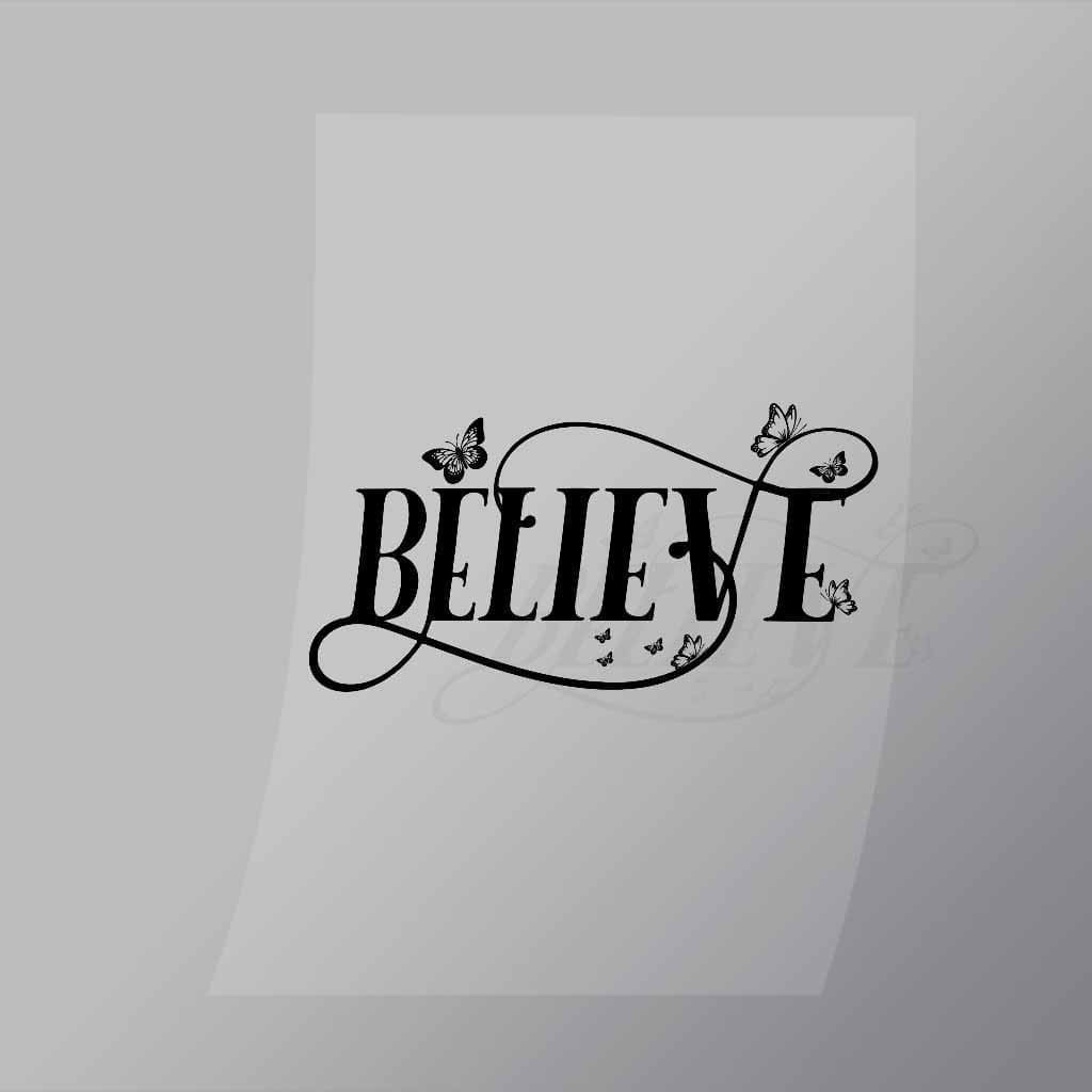 A great Believe Black DTF (Direct to Film) Transfer available in multiple sizes. (Beased on width at artwork aspect ratio)