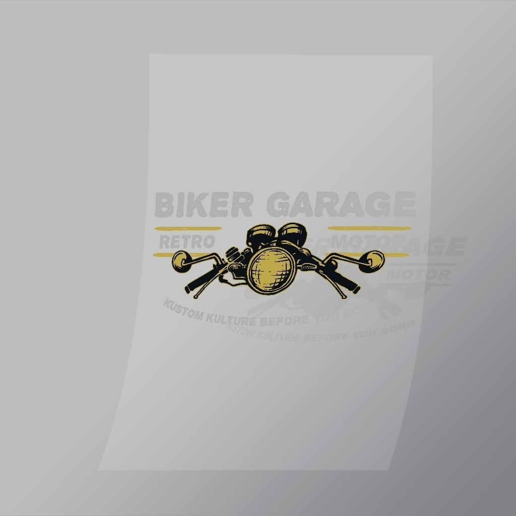 A great Biker Garage DTF (Direct to Film) Transfer available in multiple sizes. (Beased on width at artwork aspect ratio)