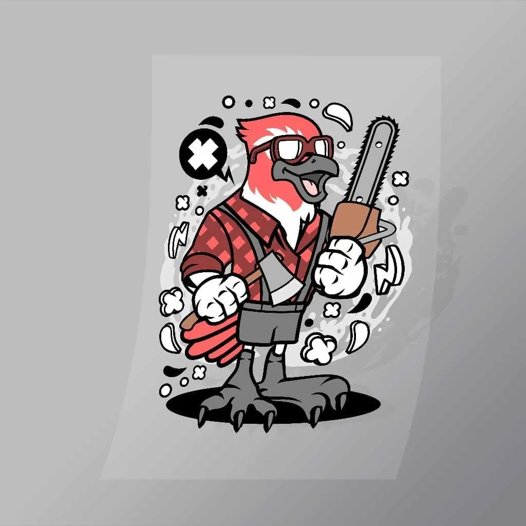 A great Bird Lumberjack DTF (Direct to Film) Transfer available in multiple sizes. (Beased on width at artwork aspect ratio)