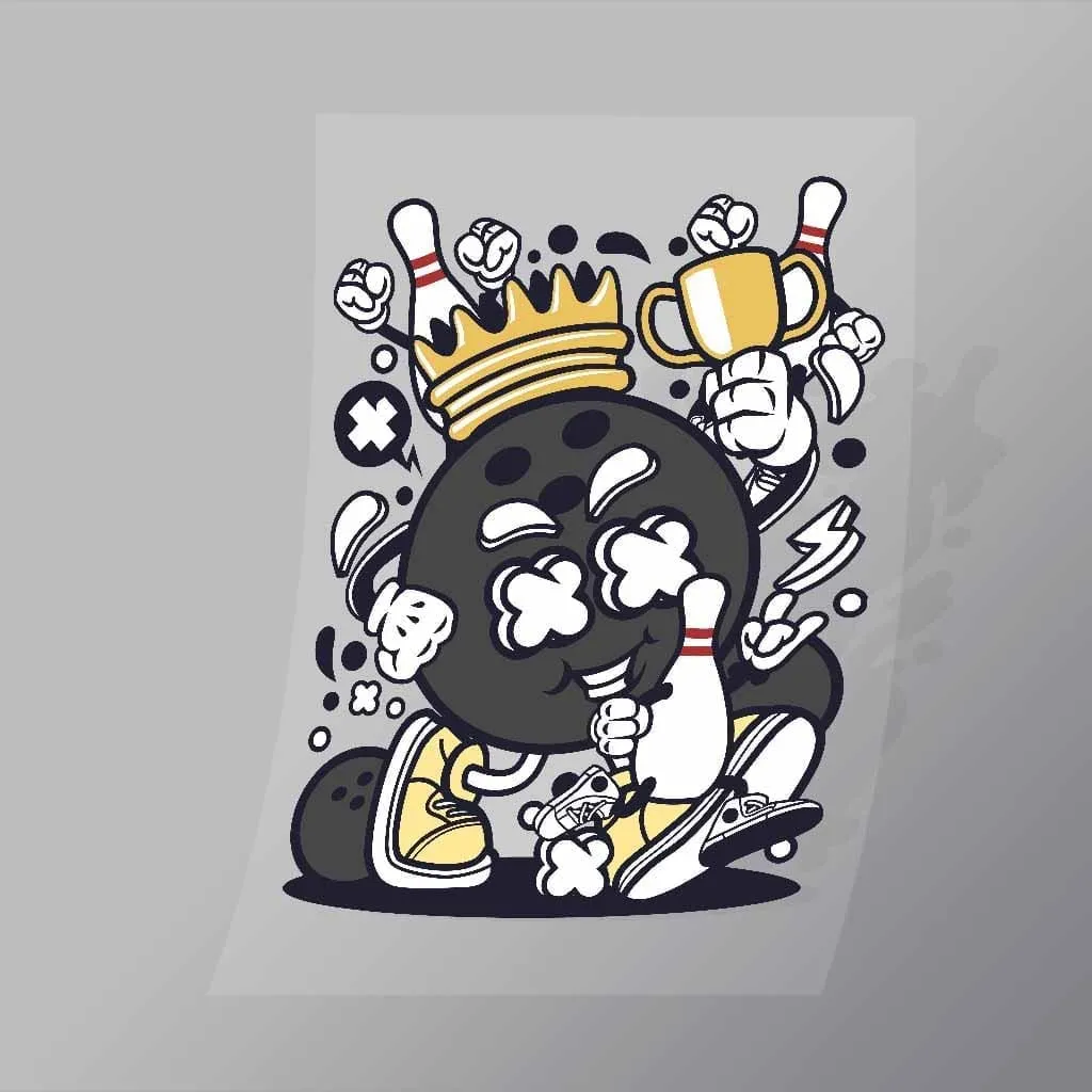 A great Bowling King DTF (Direct to Film) Transfer available in multiple sizes. (Beased on width at artwork aspect ratio)