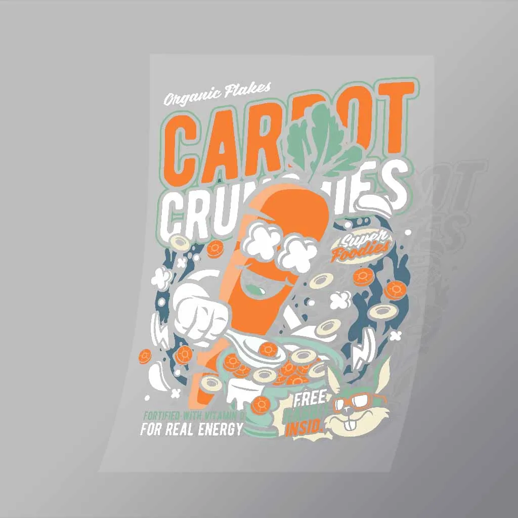 A great Carrot Crunchies DTF (Direct to Film) Transfer available in multiple sizes. (Beased on width at artwork aspect ratio)