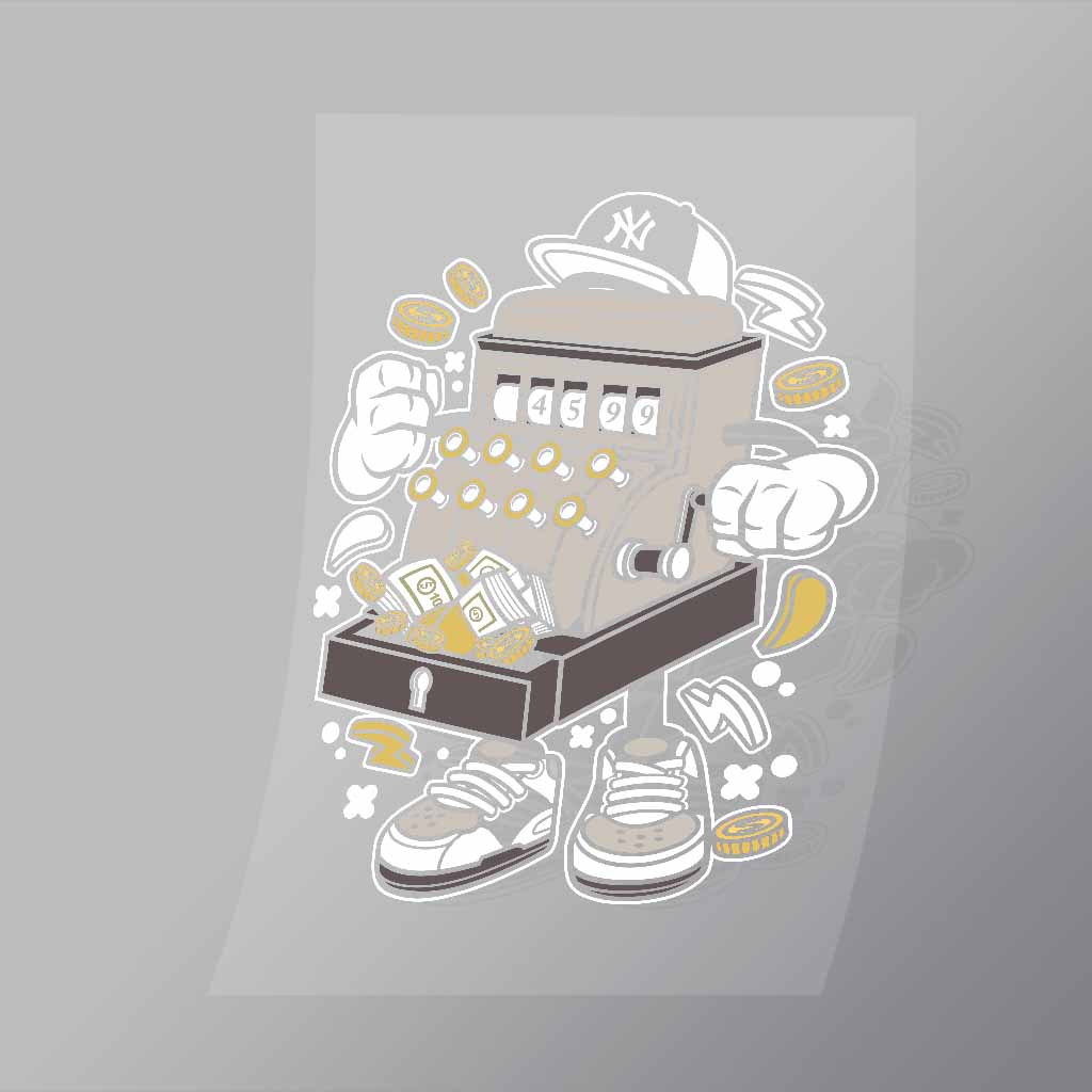 A great Cash Machine DTF (Direct to Film) Transfer available in multiple sizes. (Beased on width at artwork aspect ratio)