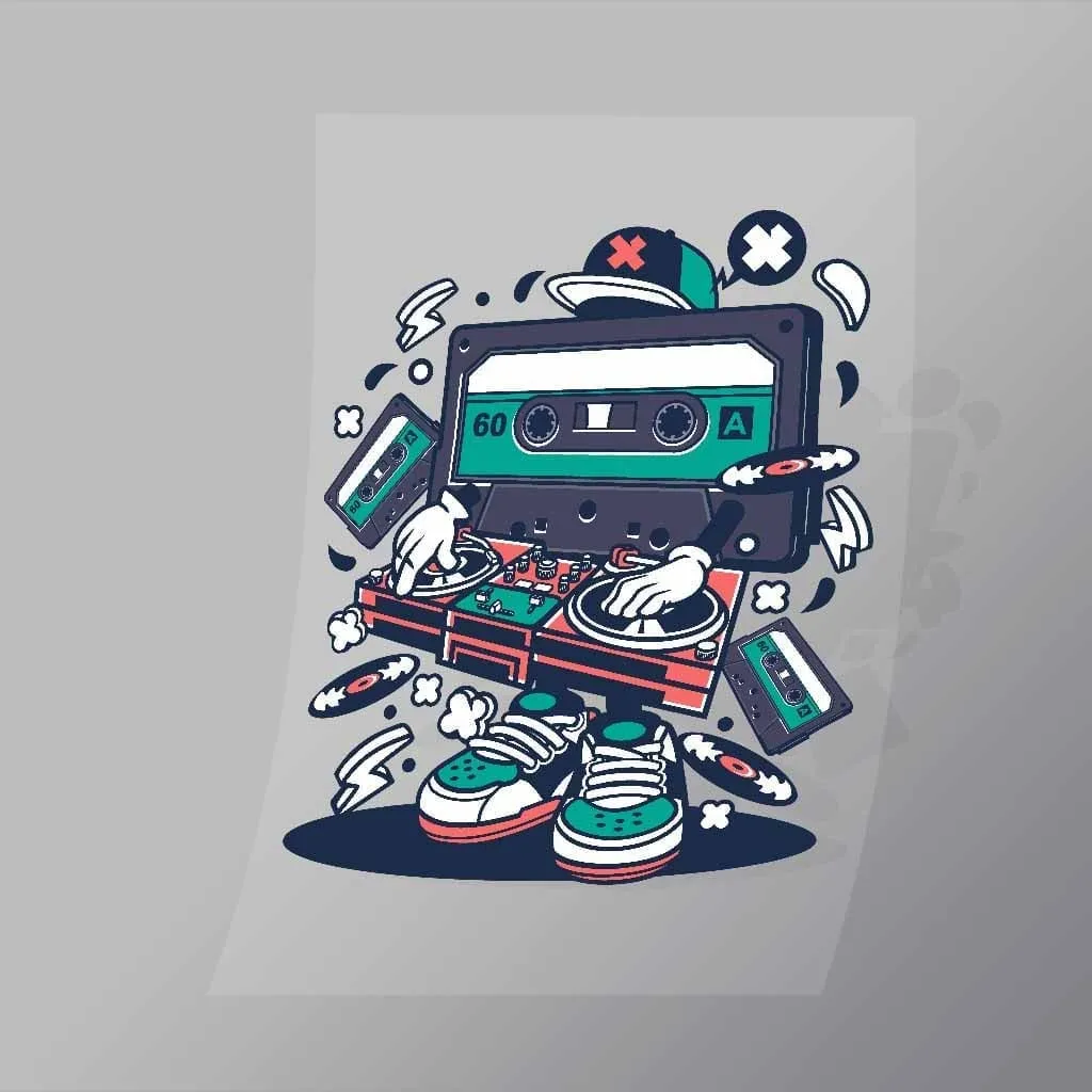A great Cassette Disk Jockey DTF (Direct to Film) Transfer available in multiple sizes. (Beased on width at artwork aspect ratio)