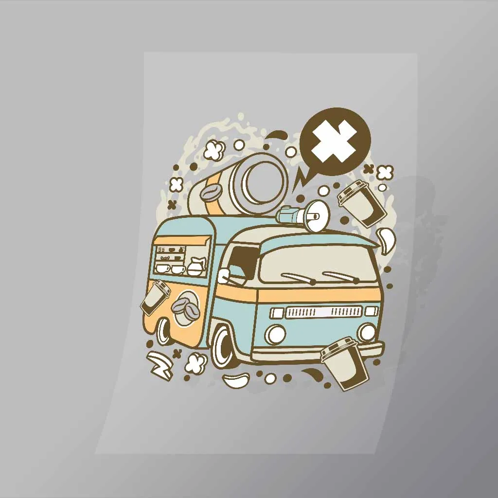 A great Coffee Van DTF (Direct to Film) Transfer available in multiple sizes. (Beased on width at artwork aspect ratio)