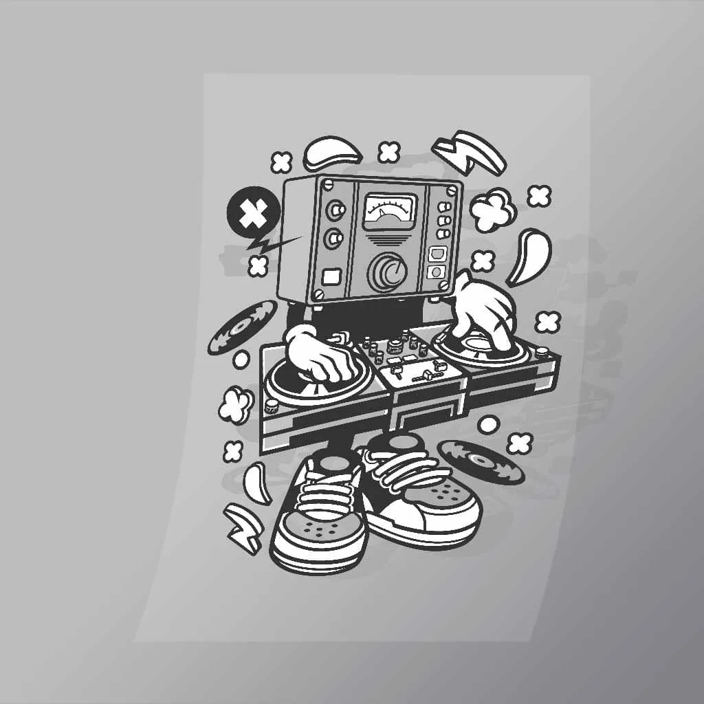 A great Dj Instrument DTF (Direct to Film) Transfer available in multiple sizes. (Beased on width at artwork aspect ratio)